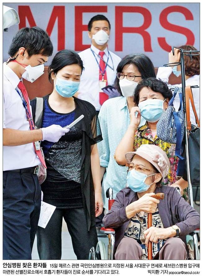 서울신문은 15일 메르스 관련 국민안심병원으로 지정된 서울 서대문구 연세로 세브란스병원 입구에 마련된 선별진료소에서 호흡기 환자들이 진료 순서를 기다리고 있는 장면을 전했다.
