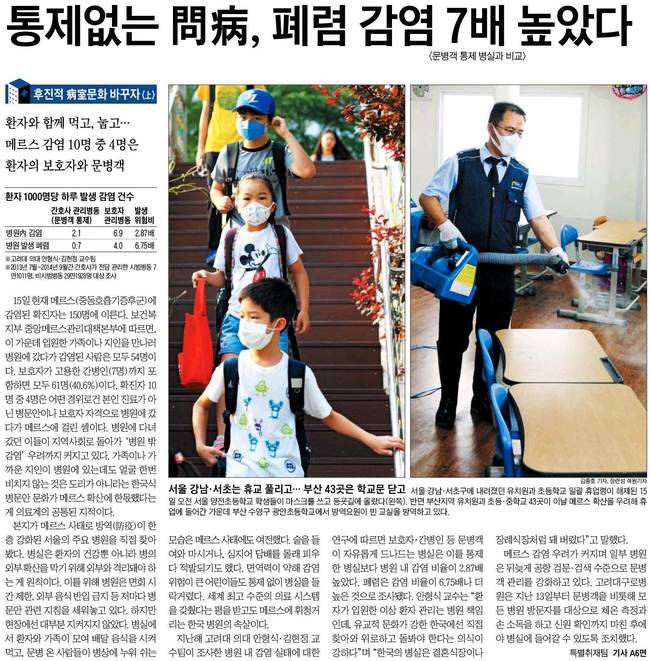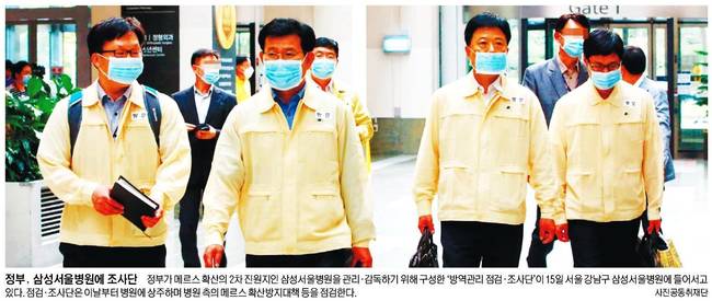 세계일보는 정부가 메르스 확산의 2차 진원지인 삼성서울병원을 관리·감독하기 위해 구성한 '방역관리 점검·조사단'이 15일 서울 강남구 삼성서울병원에 들어서고 있는 장면을 담았다. 점검·조사단은 이날부터 병원에 상주하며 병원 측의 메르스 확산방지대책 등을 점검한다.