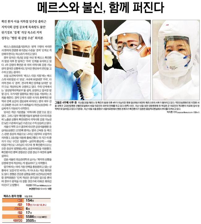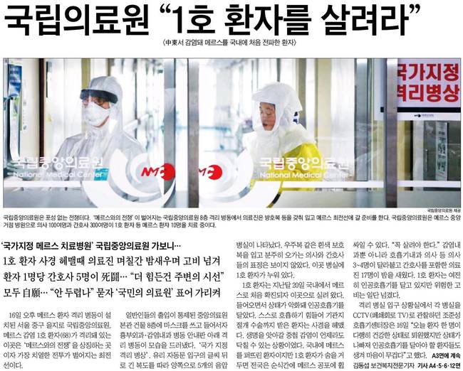 조선일보는 '메르스와의 전쟁'이 벌어지는 국립중앙의료원 8층 격리 병동에서 의료진이 방호복 등을 갖추고 오가는 모습을 담았다.