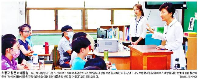 세계일보는 박근혜 대통령이 16일 오전 메르스 사태로 휴업한 뒤 지난 12일부터 정상 수업을 시작한 서울 강남구 대모초등학교를 찾아 메르스 예방을 위한 손씻기 실습 참관하는 장면을 전했다.