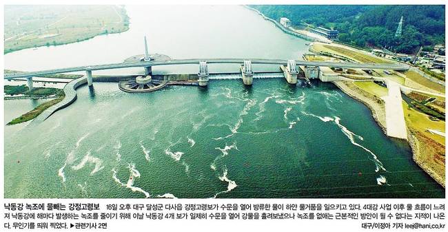 4대강 사업 이후 물 흐름이 느려져 낙동강에 해마다 발생하는 녹조를 줄이기 위해 이날 낙동강 4개 보가 일제히 수문을 열고 강물을 흘려보냈으나 녹조를 없애는 근본적인 방안이 될 수 없다는 지적이 나오고 있다고 한겨레는 전했다.