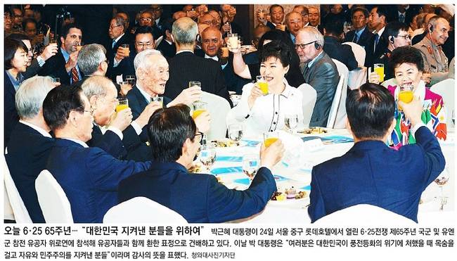 국민일보와 동아일보는 박근혜 대통령이 24일 서울 중구 롯데호텔에서 열린 6·25전쟁 제65주년 국군 및 유엔군 참전 유공자 위로연에서 참석자들과 건배하고 있는 모습을 1면 사진으로 실었다. 국민일보는 “박 대통령은 ‘사회적으로 참전 유공자를 우대하는 문화가 확산되고 그 공적이 다음 세대에게 온전히 전해지도록 더욱 노력하겠다’고 말했다”고 전했고, 동아일보는 “박 대통령이 ‘여러분은 대한민국이 풍전등화의 위기에 처했을 때 목숨을 걸고 자유와 민주주의를 지켜낸 분들’이라며 감사의 뜻을 전했다”고 보도했다.