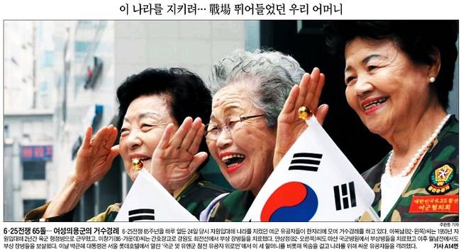 조선일보는 자원입대해 나라를 지켰던 여성 유공자들이 거수경례를 하고 있는 모습을 1면 사진으로 전했다. 조선일보는 “사진에 나와 있는 이복남씨는 1950년 자원입대해 2년간 육군 행정병으로 근무했고, 이창기씨는 간호장교로 강원도 최전선에서 부상 장병들을 치료했다”며 “안상정씨도 마산 국군병원에서 부상병들을 치료했고 이후 월남전에서도 부상 장병들을 보살폈다”고 보도했다.
