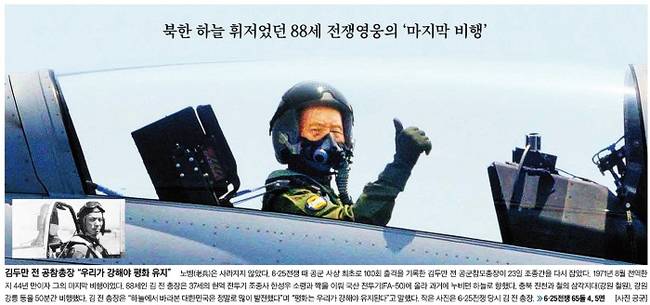 중앙일보는 6·25전쟁 때 공군 사상 최초로 100회 출격을 기록한 김두만 전 공군참모총장이 23일 조종간을 잡은 모습을 1면 사진으로 실었다. 중앙일보는 “노병은 사라지지 않았다. 88세인 그는 1971년 8월 전역한 지 44년 만에 37세의 현역 전투기 조종사 한성우 소령과 짝을 이뤄 국산 전투기(FA-50)에 올라 과거에 누비던 하늘로 향했다”며 “충북 진천과 철의 삼각지대(강원 철원), 강원 강릉 등을 50분간 비행했다”고 전했다.