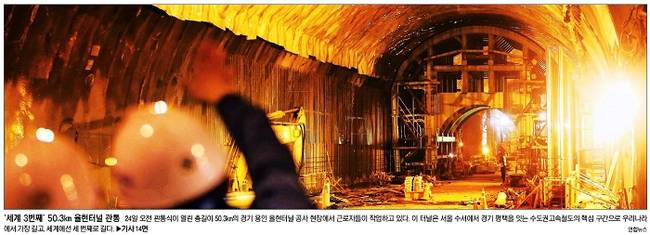 국내에서 가장 긴 수도권고속철도 율현터널이 공사한 지 3년 5개월 만에 뚫렸다. 서울신문은 24일 오전 관통식이 열린 총길이 50.3km의 경기 용인 율현터널 공사 현장에서 근로자들이 작업하고 있는 모습을 1면 사진으로 전하며 “이 터널은 서울 수서에서 경기 평택을 잇는 수도권고속철도의 핵심 구간으로 우리나라에서 가장 길고, 세계에선 세 번째로 길다”고 보도했다.