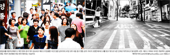 한국일보는 메르스(중동호흡기증후군) 사태 여파로 깊은 수렁에 빠졌던 우리 경제가 극도의 공포에서 조금씩 헤어 나오고 있다고 전했다. 한국일보는 24일과 지난 15일의 서울 중구 명동 상가 거리의 모습을 비교하며 “메르스 확진 환자 증가 폭이 감소하고 메르스가 발생한 지 한 달을 넘어가자 명동 상가 거리가 오랜만에 마스크를 벗고 밖으로 나온 인파로 북적거리고 있다”면서 “메르스 여파로 외국인 관광객이 급감해 거리가 한산했던 9일 전과 대조되는 모습”이라고 보도했다.
