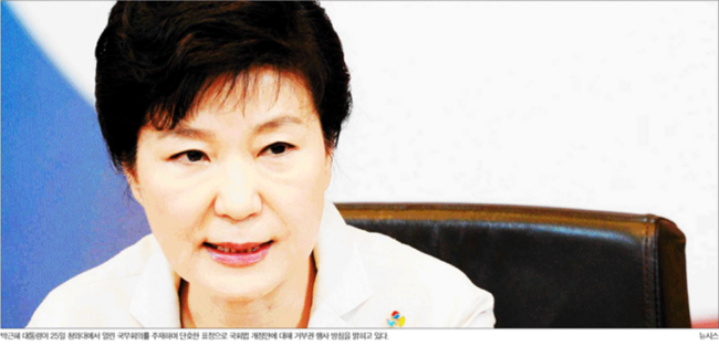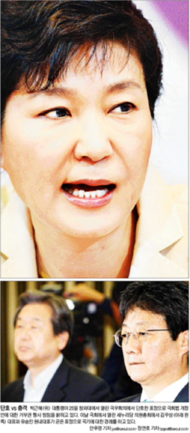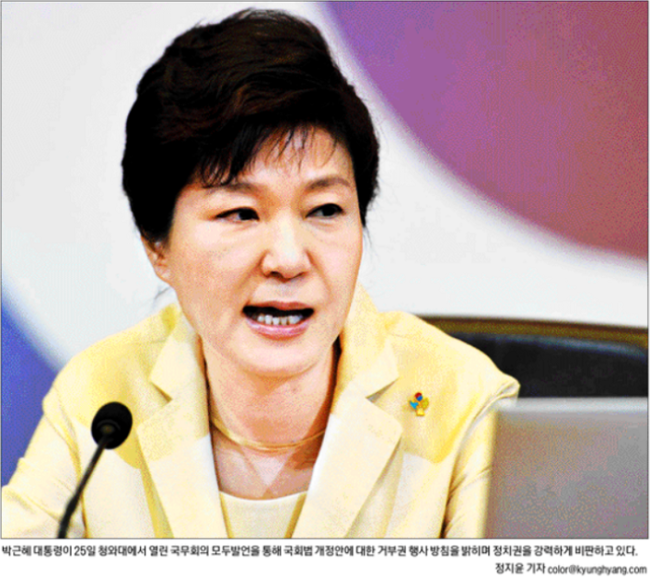경향신문은 박 대통령이 25일 청와대에서 열린 국무회의 모두발언을 통해 국회법 개정안에 대한 거부권 행사 방침을 밝히며 정치권을 강력하게 비판하고 있는 모습을 1면 사진으로 전했다. 경향신문은 “박 대통령은 여야 합의로 국회에서 의결한 법안을 거부한 것은 물론 그 법안을 만든 국회와 정치권을 ‘배신 집단’ ‘심판 대상’으로 맹비난했다”며 “성장률 저하 등 경제위기, 메르스(중동호흡기증후군) 사태로 민생과 국정이 모두 난맥인 상황에서 대통령이 국회와 여야를 향해 ‘전쟁’을 선포했다는 비판이 제기된다”고 지적했다.