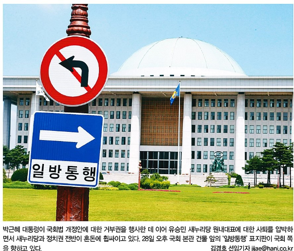 한겨레는 박근혜 대통령이 국회법 개정안에 거부권을 행사한 데 이어 유승민 새누리당 대표의 사퇴를 압박하는 것을 두고 국회 본관 건물 앞의 ‘일방통행’ 표지판을 상징적으로 내걸었다. 한겨레는 관련 기사에서 “‘도를 넘은’ 박 대통령과 친박계의 거친 공세에 대해 ‘헌정 질서를 무시하고 국회의원이기를 포기한 처사’라는 비판이 나온다”고 전했다.