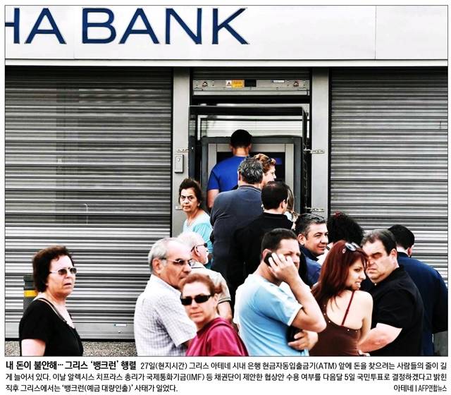 경향신문은 “구제금융으로 연명하고 있는 그리스가 디폴트(채무불이행)를 선언할 가능성이 높아졌다”고 전하며 그리스의 ‘뱅크런 행렬’을 1면 사진으로 선택했다. 경향은 사진 설명에서 “27일(현지시간) 그리스 아테네 시내 은행 현금자동입출금기(ATM) 앞에 돈을 찾으려는 사람들의 줄이 길게 늘어서 있다”며 “이날 알렉시스 치프라스 총리가 국제통화기금(IMF) 등 채권단이 제안한 협상안 수용 여부를 다음달 5일 국민투표로 결정하겠다고 밝힌 직후 그리스에서는 ‘뱅크런(예금 대량인출)’ 사태가 일었다”고 전했다.