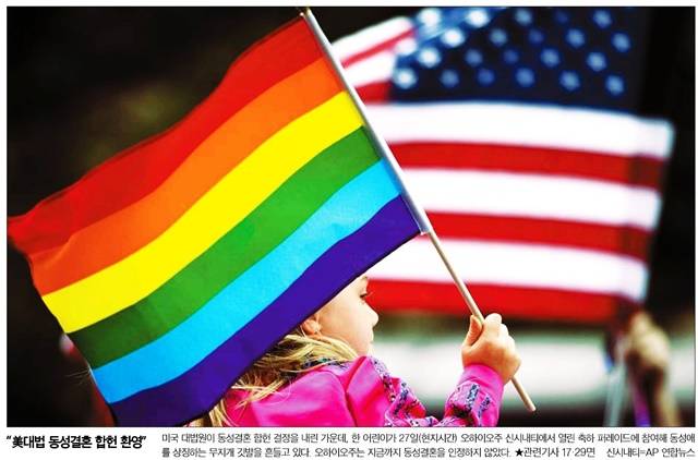 미국 대법원이 동성결혼 합헌 결정을 내린 가운데 한국일보는 오하이오주 신시내티에서 열린 축하 퍼레이드에서 한 어린이가 동성애를 상징하는 무지개 깃발을 흔드는 모습을 1면에 실었다.