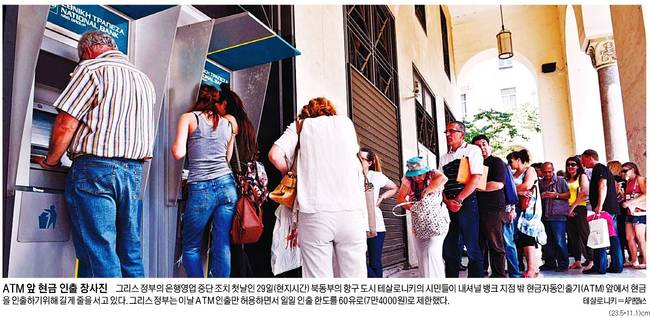 세계일보는 그리스 정부의 은행영업 중단 조치 첫날인 29일(현지시간) 현금자동인출기(ATM) 앞에서 현금을 인출하기 위해 길게 줄을 서고 있는 그리스 시민들의 모습을 1면 사진으로 실었다. 세계일보는 “독일과 프랑스 등 채권단은 (그리스 사태가) 다른 유로존 회원국으로 불똥이 튈 것을 우려하고 있다”며 “그리스 좌파 정권과 유럽 부국 간 ‘기싸움’의 최대 피해자는 그리스 국민이다”고 보도했다.