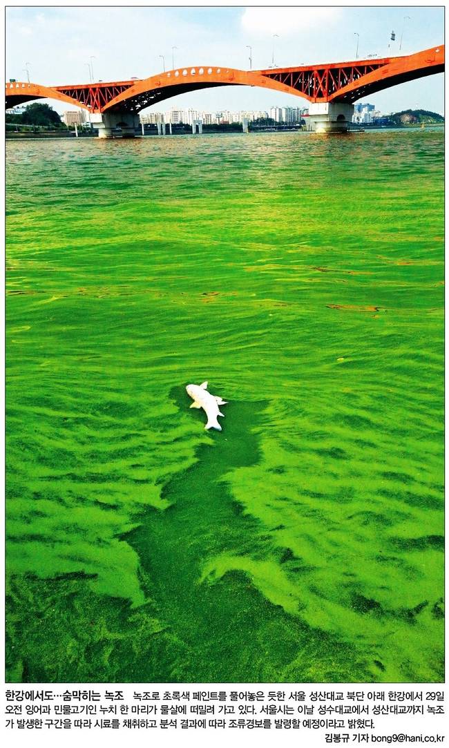 한겨레는 녹조로 초록색 페인트를 풀어놓은 듯한 서울 성산대교 북단 아래 한강에서 잉어과 민물고기인 누치 한 마리가 물살에 떠밀려 가고 있는 모습을 1면 사진으로 보도했다. 한겨레는 “서울시는 성수대교에서 성산대교까지 녹조가 발생한 구간을 따라 시료를 채취하고 분석 결과에 따라 조류경보를 발령할 예정”이라고 보도했다.
