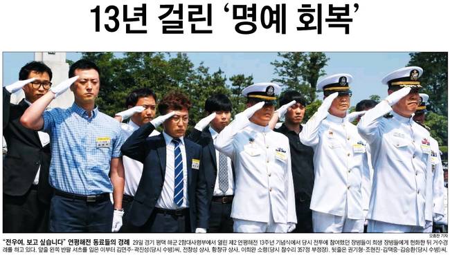 조선일보는 29일 제2 연평해전 13주년 기념식에서 당시 전투에 참여했던 장병들이 희생 장병들에게 헌화한 뒤 거수경례를 하는 모습을 1면 사진으로 보도했다. 조선일보는 “현직 국방장관이 제2 연평해전 기념식에서 추모사를 낭독한 것은 처음이며 승전으로 규정한 것 또한 처음이다”며 “이날 여야는 당시 군인연금법상 전사(戰死) 규정이 없어 순직자로 보상받은 희생자 6명을 전사자로 예우하는 특별법을 만들기로 했다”고 전했다.