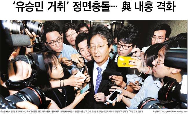 한국일보는 같은 날 최고위원회를 마치고 나오면서 취재진의 질문공세를 받고 있는 유 원내대표를 1면 사진에 실었다. 한국일보는 “국정운영에 무한책임을 지고 있는 여권이 계파 권력다툼에 매몰되면서 메르스·추경 편성 등 민생정잭은 모두 뒷전으로 밀리고 있다”며 “박 대통령은 이날 신속한 추경 편성을 지시했지만, 여권 내 권력투쟁 심화와 국회 공전으로 추경안 논의 자체가 불가능해진 상황의 출발점이 박 대통령의 유 원내대표 비토 발언이었다는 점에서 이날 지시는 이율배반이라는 비판이 나오고 있다”고 보도했다.