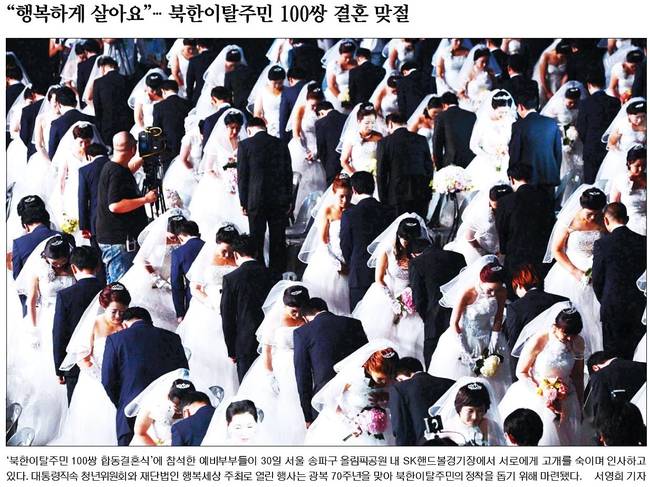 국민일보는 북한이탈주민 100쌍 합동결혼식의 모습을 1면 사진에 담았다. 대통령직속 청년위원회와 재단법인 행복세상 주최로 열린 행사는 광복 70주년을 맞아 북한이탈주민의 정착을 돕기 위해 마련됐다.