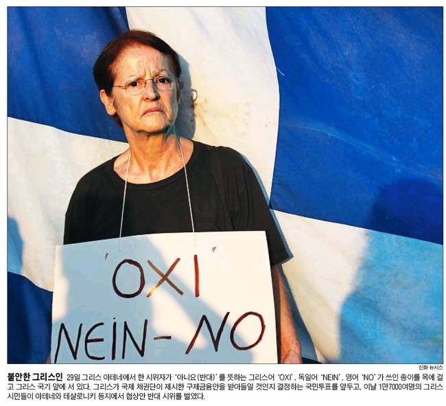 조선일보는 그리스가 국제 채권단이 제시한 구제금융안을 받아들일 것인지 결정하는 국민투표를 앞두고 협상안 반대 시위를 벌이는 그리스인의 모습을 1면에 담았다. 조선일보는 현지 르포기사를 통해 “IMF 부채 16억유로를 상환하지 못하면 그리스는 파산 선고를 받게 된다”며 “이뿐 아니라 그리스 중앙정부의 총부채는 약 3200억유로(약 400조원), 그리스 GDP(국내총생산)의 177%에 달한다”고 보도했다.