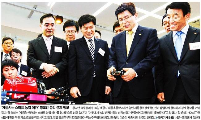 세종에서 전국 14번째 창조경제혁신센터가 문을 열었다. 동아일보와 중앙일보는 출범식에 참석한 황교안 국무총리가 무인 로봇 제초기를 시험 작동하는 모습을 1면 사진에 담았다. 동아일보는 “세종혁신센터는 농업과 ICT가 결합한 ‘스마트 농업의 메카’로 만들어질 계획이다”고 보도했다.