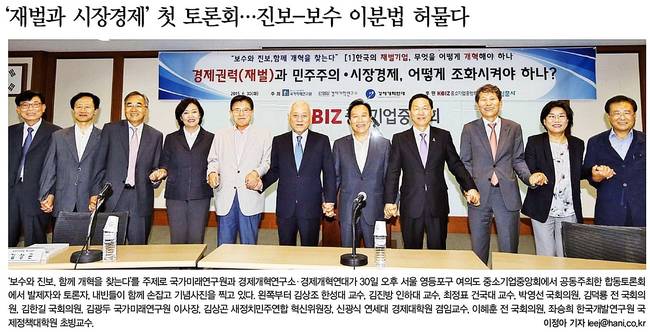 한겨레는 ‘보수와 진보, 함께 개혁을 찾는다’는 주제로 개혁적 보수를 표방하는 국가미래연구원과 합리적 진보를 표방하는 경제개혁연구소·경제개혁연대가 공동주최한 합동토론회에서 토론자, 내빈들이 함께 손잡고 기념사진을 찍는 모습을 1면에 실었다. 한겨레는 “‘재벌과 시장경제’ 첫 토론회에서 진보와 보수의 이분법을 허물었다”며 “발표자와 토론자들 모두 기존의 진영논리를 깨는 솔직하고 날카로운 주장을 폈다”고 보도했다.