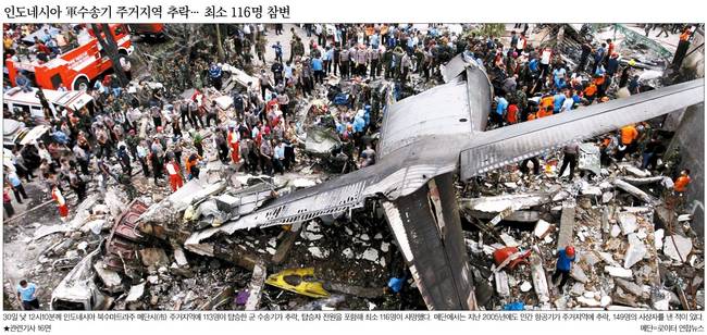 세계일보와 한국일보는 인도네시아 북수마트라주 메당시 주거지역에 113명이 탑승한 군 수송기가 추락해 탑승자 전원을 포함 최소 116명이 숨진 현장 사진을 1면에 실었다. 한국일보는 “대부분 군인과 그의 가족들이 타고 있었던 것으로 추정되는 이 수송기는 이륙 2분여 만에 추락했다”며 “이 지역은 2005년에도 여객기가 추락해 149명이 사망하는 참사가 발생한 적이 있다”고 전했다.