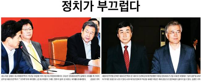 중앙일보는 최고위원회의 모습과 함께 새정치민주연합 문재인 대표와 문 대표의 인선에 강하게 반발했던 이종걸 원내대표가 2일 ‘심야 담판’을 끝낸 뒤 무거운 표정으로 나오는 장면을 1면 사진에 담았다. 중앙일보는 “냉랭한 당·청 관계가 지속되면 정부가 경기 회생을 위해 긴급히 편성한 ‘15조원+ α’의 추경안도 제때 처리될 수 있을지 미지수”라며 “4.29재·보선 참패를 딛고 혁신하겠다던 제1야당의 모습도 실망스럽다. 반복과 단절, 갈등의 정치를 보는 국민들의 시선은 비판을 넘어 나라를 걱정하는 수준으로 번지고 있다”고 보도했다.