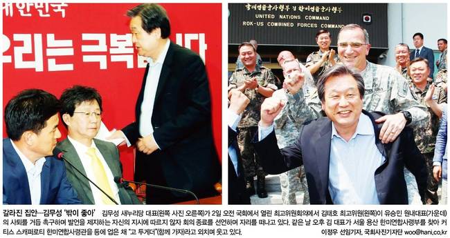 한겨레는 최고위원회 회의 종료를 선언하며 자리를 떠나는 김무성 대표의 모습과 같은 날 오후 김 대표가 서울 용산 한미연합사령부를 찾아 한미연합사령관을 등에 업은 채 “고 투게더”(함께 가자)라고 외치며 웃고 있는 모습을 1면 사진에 함께 실었다.