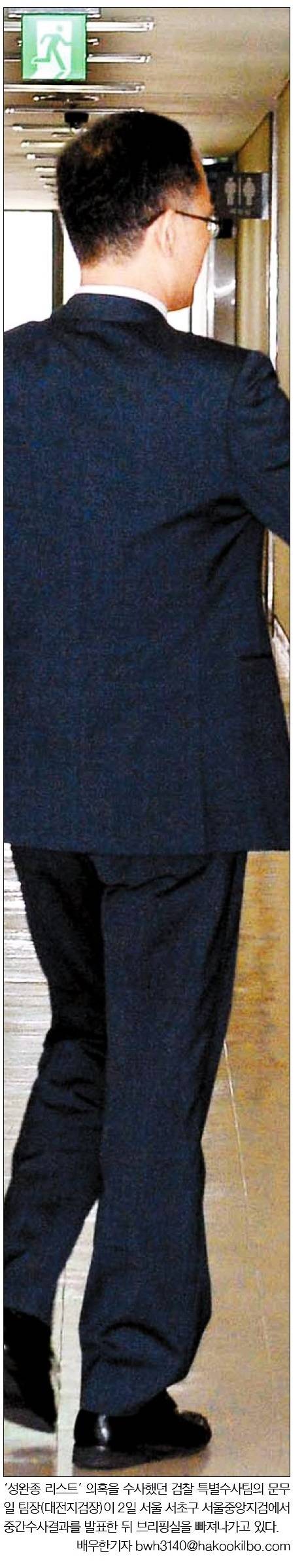 한국일보는 성완종 리스트 의혹을 수사했던 검찰 특별수사팀의 문무일 팀장(대전지검장)이 서울중앙지검에서 중간수사결과를 발표한 뒤 브리핑실을 빠져나가고 있는 뒷모습을 1면 사진으로 보도했다. 한국일보는 “사건의 핵심인 대선자금 의혹 부분은 증거부족 등을 이유로 ‘사실상 허위’라는 결론을 내렸다”며 “하지만 성 전 회장의 메모와 언론 인터뷰 등에 담긴 정치권 금품 로비 중 일부는 사실인 것으로 드러나, 검찰의 칼이 대선자금 의혹 앞에서 무뎌진 게 아니냐는 지적이 나온다”고 했다.