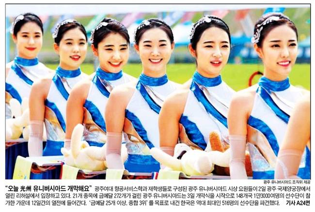 조선일보는 광주 유니버시아드 개막을 하루 앞둔 2일 광주여대 항공서비스학과 재학생들로 구성된 광주 유니버시아드 시상 요원들이 광주 국제양궁장에서 열린 리허설에 참석한 모습을 1면에 실었다. 조선일보는 “21개 종목에 금메달 272개가 걸린 이번 대회는 148개국 1만3000여명의 선수단이 참가해 12일간의 열전에 들어간다”며 “금메달 25개 이상, 종합 3위를 목표로 내건 한국은 역대 최대인 516명의 선수단을 파견했다”고 전했다.