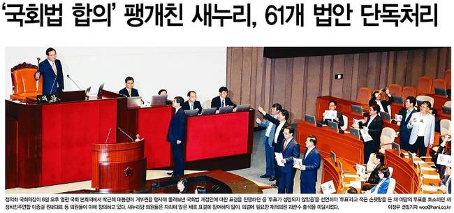 경향신문은 6일 새누리당 의원들이 자리에 앉은 채 국회법 개정안 재의 표결에 불참하거나 퇴장해 의석이 비어있는 본회의장의 모습을 1면에 실었다. 경향신문은 “재의 요건을 채우기 위해선 전체 298석 중 3분의 2이상이 찬성해야하지만 160석인 새누리당이 빠져 이를 충족하지 못했다”며 “38일 전 여야 합의에 이어 자신들 손으로 통과시킨 법안을 ‘집단 보이콧’했다”고 지적했다. 이어 “과반 의석을 가진 제1당의 선택은 결국 민주주의의 근간인 ‘의회주의’대신 ‘대통령 심기’였던 셈”이라 비판했다.