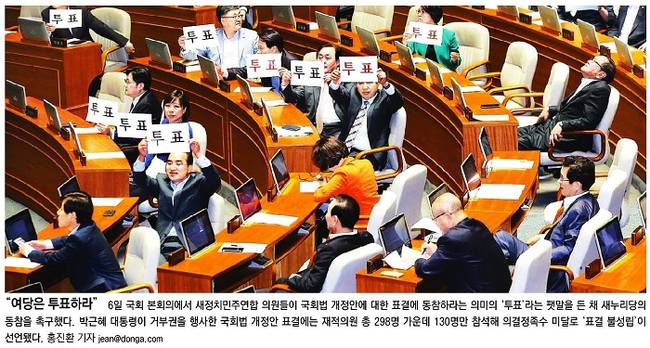 동아일보도 여당의 투표를 촉구하는 새정치민주연합 의원들의 모습을 1면에 실었다. 동아일보는 사진설명을 통해 “의결정족수 미달로 ‘표결 불성립’이 선언됐다”는 사실을 전했다. 관련 기사에서는 표결 불성립에 대한 김무성 새누리당 대표의 사과와 유승민 원내대표의 거취, 친박계 의원들의 집단행동, 이에 따른 당내 계파갈등 증폭 가능성에 대해 언급했다. 동아일보는 “야당은 여당의 국회법 개정안 표결 불참에 반발해 이날 처리할 예정이었던 크리우드 펀딩법 등 61개 법안의 표결에 참여하지 않았다”고 전했다.