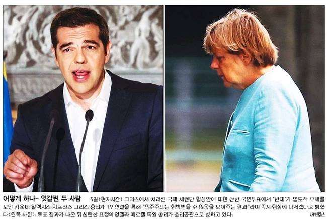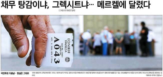 한국일보도 그리스 국민투표 다음날, 그리스가 마주한 현실의 모습에 시선을 기울였다. 한국일보는 채권단 긴축안이 부결된 후 아테네 한 국영은행 앞에서 연금을 수령하기 위해 대기표를 들고 있는 연금생활자의 주름진 손을 포착한 사진을 대문사진으로 선택했다. 한국일보는 “긴축 요구안 거부로 세계 경제의 눈이 앙겔라 메르켈 총리에게 쏠리고 있다”며 “그리스 최대 채권국이자 추가 긴축안을 가장 강하게 고집한 독일이 어떻게 대응하느냐에 따라 유로존 전체의 미래가 좌우되기 때문”이라고 밝혔다. 한국일보는 “독일이 채무 탕감 등 일부조건을 완화하면 그리스는 숨통이 트일 수 있지만 메르켈 총리가 스스로 고수해 온 유로존 원칙을 스스로 무너뜨리는 셈이 된다”고 했다. 그러면서 “강경노선을 고수할 경우 그리스가 유로존을 탈퇴, 대혼란에 빠질 수 있고 후폭풍이 세계 경제뿐 아니라 유럽 내 지정학적 균형까지 뒤흔들 가능성이 커 부담”이라고 설명했다.