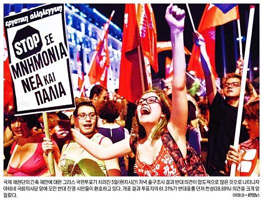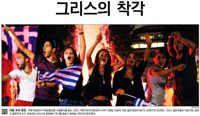 조선일보도 국민투표 결과에 환호하는 그리스 젊은이들의 모습을 1면 사진으로 걸었다. 조선일보는 관련 기사를 통해 그리스 의회가 있는 아테네 중심 신타그마 광장 현장의 모습을 상세히 전하며 “그리스 국민은 반대표 압승을 기념하는 축제를 한바탕 끝낸 후 혹독한 현실에 다시 직면한 모습”이라고 보도했다.