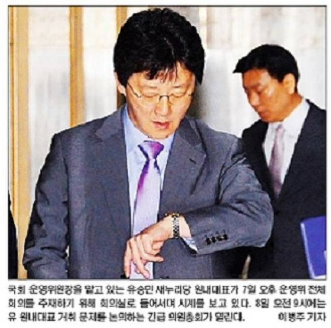 국민일보는 유 원내대표가 7일 오후 운영위 전체 회의를 주재하기 위해 회의실로 들어서며 시계를 보는 모습을 1면 사진으로 선택했다. 국민일보는 “지난달 25일 ‘배신의 정치’ 발언으로 야기됐던 ‘유승민 거취’ 정국이 13일 만에 유 원내대표의 사퇴로 끝맺는 것이 아니냐는 관측이 제기된다”며 “비주류 의원들을 중심으로 반발하는 움직임이 있어 긴급 의총이 순탄하게 이뤄지지 않을 가능성도 배제할 수 없다”고 전했다. 이어 “새누리당 내부에서는 재신임 여부와 관련해 표결을 실시하면 내전이 폭발할 것이라는 우려가 높다”면서 “(원내대표 사퇴권고) 결의안 채택에 대해 결론을 내지 못할 경우 표 대결까지 갈 가능성도 배제할 수 없다”고 예측했다.