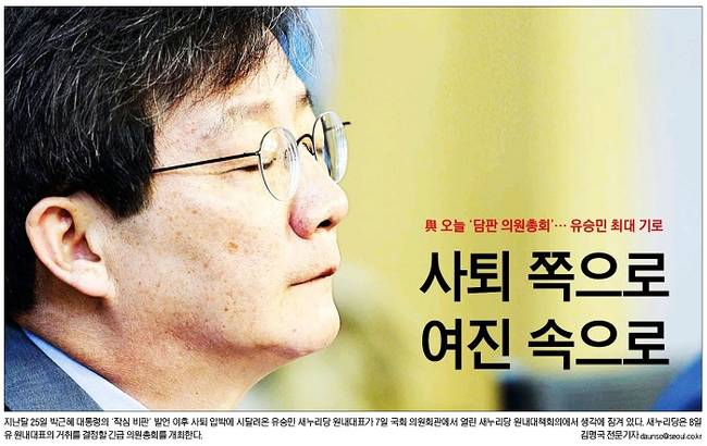 서울신문은 이날 국회 의원회관에서 열린 새누리당 원내대책회의에서 생각에 잠김 유 원내대표의 표정을 전면에 내세웠다. 서울신문은 “현재로선 의총에서 사퇴 권고 결의안이 채택될 가능성이 커보인다. 당청 갈등과 비판여론이라는 이중고에서 벗어나야 한다는 게 대체적인 당내 분위기다. 그동안 중립적인 입장을 취해온 비박계 핵심이자 당내 최대 계파인 김무성 대표 진영 역시 사퇴 불가피론으로 쏠리는 모양새”라며 “유 원내대표의 사퇴를 반대하는 비박계를 중심으로 의총 자체를 보이콧할 여지도 남아있다”고 분석했다. 서울신문은 또 “사퇴여부 못지 않게 사퇴시점도 관심거리”라며 “7월 임시국회 종료 때까지 시한부 유임 의사를 드러낼 가능성도 있다. 유 원내대표가 의총 직후 던질 정치적 메시지에도 관심이 쏠린다”고 밝혔다.