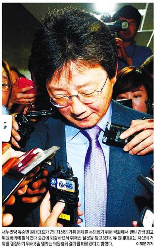 청와대와 친박계의 사퇴압박을 받아온 유승민 새누리당 원내대표의 거취가 8일 동료의원들의 뜻에 따라 결정될 전망이다. 새누리당이 7일 긴급 최고위원회의에서 “8일 오전9시 의원총회를 열어 유승민 원내대표 거취에 관한 논의를 진행하기로 했다”고 밝히면서 유 원내대표를 둘러싸고 벌어졌던 여권의 내분 사태도 중대기로를 맞았다. 유 원내대표는 이날 의총에 참석하지 않고 어떤 결정이든 따를 계획이라고 밝혔다. 8일 대부분의 주요 신문들은 이 같은 내용과 함께 유 원내대표의 사진을 1면에 실었다.