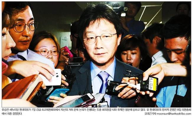 한국일보도 최고위원회의를 마치고 취재진의 질문을 받는 유 원내대표의 사진을 1면에 사용했다. 한국일보 역시 친박계와 비박계간 치열한 공방을 예상하며 “유 원내대표의 거취는 개인의 진퇴여부를 떠나 새누리당이 혁신보수로 나아갈 것인지 아니면 과거로 회귀할 것인지를 결정짓는 변곡점이라는 분석이 많다”며 “새누리당은 이제 2016년 총선을 박 대통령 중심의 구체제로 치를지, 유 원내대표의 혁신보수 체제로 치를 것인 두고 갈림길에 선 형국”이라고 관측했다. 한국일보는 “의원들이 직접 선출한 원내대표의 거취가 청와대의 의중에 따라 좌우됐다는 점에서 당내 민주주의 후퇴라는 지적도 피하기 어렵다”며 “당 안팎에선 내년 총선 공천에 대한 친박계의 불안감이 이번 논란을 키웠고, 결과적으로 김 대표가 추진해 온 상향식 공천도 무산될 가능성이 높다는 분석이 나온다”고 설명했다.