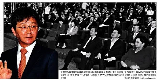 경향신문은 지난해 9월 새누리당 의원총회에 참여한 의원들의 모습과 유승민 원내대표의 사진을 함께 대문사진으로 선택했다. 경향신문은 유 원내대표가 퇴임의 말을 통해 밝힌 헌법 1조 1항(“대한민국은 민주공화국”)을 적극 강조하며 “지난 6일 국회법 개정안 재의 표결 보이콧과 함께 한국 정치사의 오점으로 남을 두 가지 독단을 힘으로 관철한 것”이라며 “국민도, 비민주적리더십의 상징이 된 대통령도, 정부 하부기관으로 전락한 국회도, 권력에 무릎 꿇은 여당도 모두 ‘패배자’라는 지적이 나온다”고 비판했다.