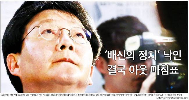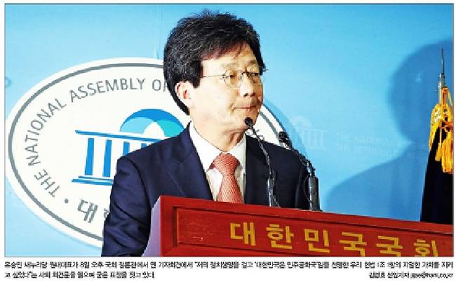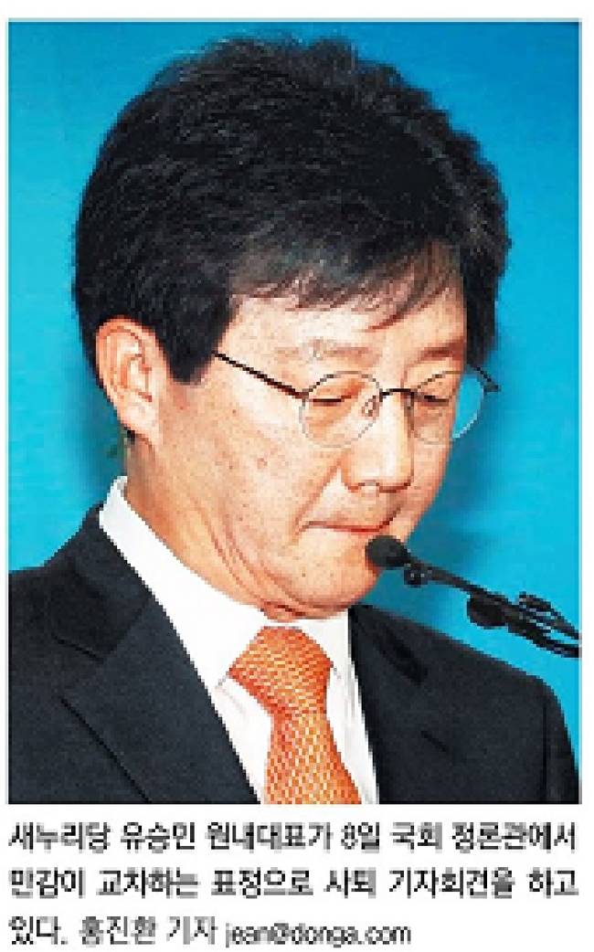 유 원내대표는 사퇴 기자회견에서 “의총의 뜻을 받들어 원내대표직에서 물러난다”며 “무엇보다 국민 여러분께 사죄의 말씀을 드린다”고 했다. 그는 “평소 같았으면 진작 던졌을 원내대표 자리를 끝내 던지지 않았던 것은 내가 지키고 싶었던 가치가 있었기 때문”이라며 “그 가치는 법과 원칙, 그리고 정의”라고 말했다. 그러면서 “내 정치 생명을 걸고 대한민국은 민주공화국임을 천명한 우리 헌법 1조1항의 지엄한 가치를 지키고 싶었다”고 했다. 9일 모든 주요 일간지들은 이 같은 발언과 함께 유 원내대표의 사진을 1면에 실었다.