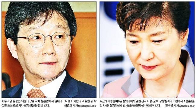 서울신문은 이날 원내대표직 사퇴의사를 밝힌 뒤 기자들의 질문을 받는 유 원내대표와 청와대에서 열린 전국 시장, 군수, 구청장과의 오찬장에 참석한 박 대통령의 모습을 나란히 1면에 넣었다. 서울신문은 유 원내대표의 사퇴 발언을 자세히 전하며 ‘헌법 1조 1항 발언’과 관련 “사퇴요구가 민주주의라는 대원칙에 부합하지 않는다는 점을 우회적으로 비판한 것으로 해석된다”고 설명했다. 또 이에 대한 청와대와 문재인 새정치민주연합 대표의 반응을 보도했다.