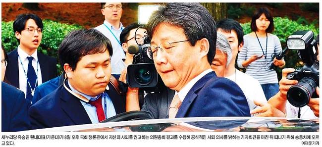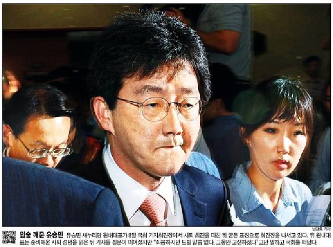 한국일보는 사퇴 기자회견장으로 이동 중인 유 원내대표의 모습을 1면에 실었다. 한국일보는 “새누리당 내홍은 일단락됐지만 친박과 비박간 계파갈등이 완전히 해소될지는 미지수”라며 “내년 총선 공천에서 영향력을 행사할 새로운 지도부 구성을 둘러싸고 계파갈등이 재연될 가능성도 배제할 수 없다”고 예상했다.