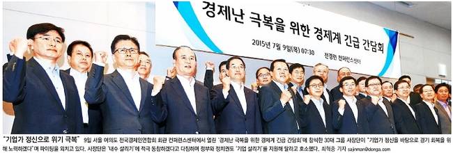 동아일보는 이날 서울 여의도 전국경제인연합회 회관에서 열린 간담회 현장에서 30대 그룹 사장단이 파이팅을 외치고 있는 모습을 1면에 걸었다. 동아일보는 이들이 “기업가 정신을 바탕으로 경기회복을 위해 노력하겠다”며 “내수 살리기에 적극 동참하겠다고 다짐하며 정부와 정치권도 기업살리기를 지원해달라고 호소했다”고 전했다. 동아일보는 그러면서 1면 톱 기사를 통해 “중국 증시 폭락, 그리스 채무 불이행, 경제성장률 하락 등 한국 경제가 대내외 악재에 둘러싸인 상황에서 정부가 내놓은 경제대책 307건 중 절반인 152건은 이미 발표한 적이 있는 ‘재탕정책’인 것으로 나타났다”고 지적했다.