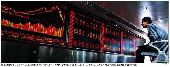 조선일보는 베이징 증권사-객장에서 시세 전광판을 바라보는 투자자 사진을 대문사진으로 걸었다. 조선일보는 “세계 금융시장에서 중국발 증시 불안은 그리스 사태보다 더 큰 파장을 일으키고 있다”며 “지난해 6월 이후 1년간 상하이 종합지수는 2배 넘게 올라 7년여 만에 최고치인 5166까지 치솟았다. 빚내서 투자한 9000만명의 중국 개미 투자자는 ‘부자가 됐다’고 환호성을 질렀다. 하지만 이후 3년간 주가가 30%넘게 폭락하면서 대혼란이 벌어지고 있다”고 밝혔다. 그러면서 “중국 증시폭락으로 실물경제에까지 불똥이 튈 것이라는 우려도 나온다”고 했다.