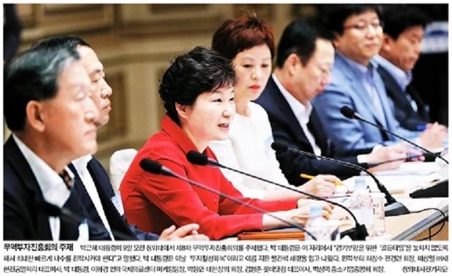 중앙일보는 9일 제8차 무역투자진흥회의를 주재한 박근혜 대통령의 사진을 1면에 실었다. 중앙일보는 “박 대통령은 이 자리에서 ‘경기부양을 위한 골든타임을 놓치지 않도록 해서 최대한 빠르게 내수를 진작시켜야 한다’고 말했다”고 전했다. 중앙일보는 관련기사에서 “경제상황이 심상치 않게 흐르자 박근혜 대통령도 ‘경제 총력전 모드’로 나섰다”며 “‘지금의 어려운 상황을 벗어나기 위해선 무엇보다 위축된 투자와 소비심리를 회복시키는 것이 중요하다’고 말했다”고 전달했다.