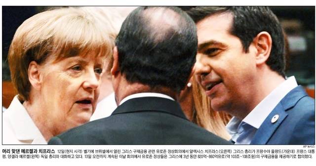 유로존 정상들이 17시간의 마라톤 회의 끝에 그리스에 대한 ‘3차 구제금융’에 합의했다. 그리스는 채권단이 요구한 강도 높은 개혁안을 수용하는 대가로 유럽재정안정화기구(ESM)를 통해 3년 동안 최대 860억 유로(약 108조원)의 구제금융을 제공받는다. 이로써 그리스의 유로존 탈퇴를 뜻하는 ‘그렉시트’는 피하게 됐다.