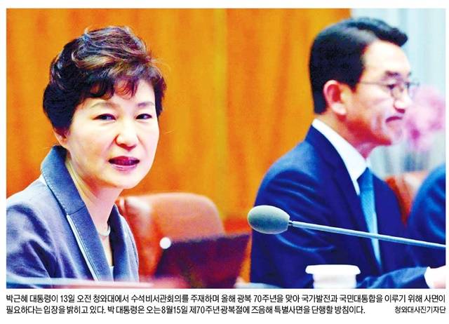 박근혜 대통령이 다음달 15일 제70주년 광복절에 특별사면을 단행할 방침임을 밝혔다. 세계일보는 1면에 박 대통령이 수석비서관회의를 주재하는 모습을 싣고 “박 대통령이 광복절 특사 방침을 공식화함에 따라 취임 후 두 번째 사면이 이뤄질 전망”이라며 “이에 따라 이번 사면에선 정·재계 인사들이 포함될지 여부도 주목된다”고 보도했다.