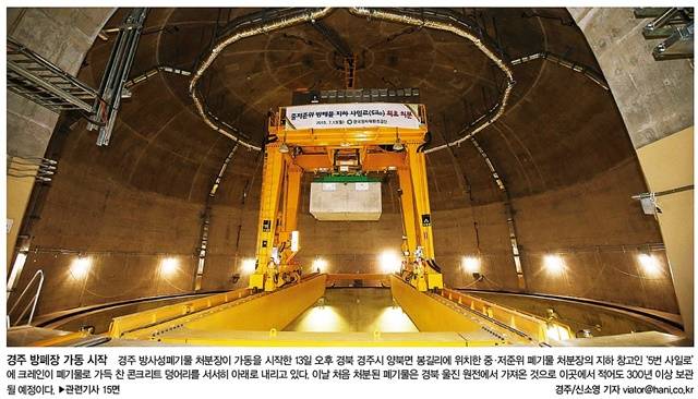 한겨레는 지난 13일 가동을 시장한 경주 방사성폐기물 처분장 모습을 1면에 실었다. 한겨레는 “경북 경주시 양북면 봉길리에 위치한 중·저준위 폐기물 처분장의 지하 창고인 ‘5번 사일로’에 크레인이 폐기물로 가득 찬 콘크리트 덩어리를 서서히 아래로 내리고 있다”며 “이날 처음 처분된 폐기물은 경북 울진 원전에서 가져온 것으로 이곳에서 적어도 300년 이상 보관될 예정”이라고 전했다.