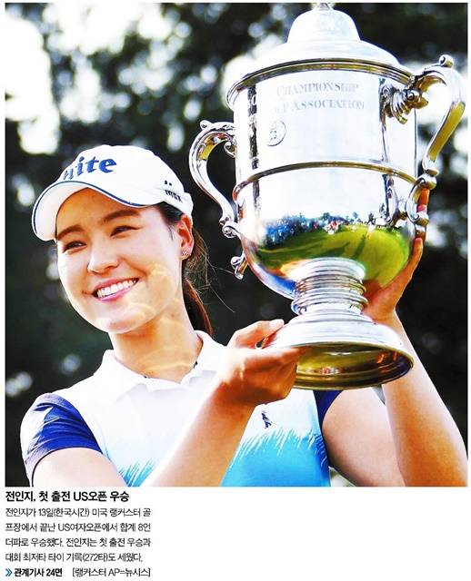 중앙일보는 미국 랭커스터 골프장에서 열린 US여자오픈에서 합계 8언더파로 우승한 전인지 선수의 사진을 1면에 실었다. 중앙은 “전인지는 첫 출전 우승과 대회 최저타 타이기록(272타)도 세웠다”고 보도했다.