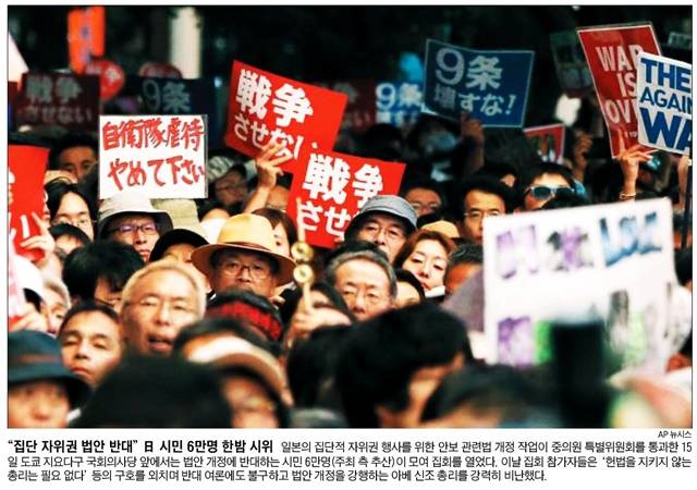 조선일보는 법안 개정에 반대하는 일본 시민들의 집회 모습을 1면에 싣고 “이날 집회 참가자들은 ‘헌법을 지키지 않는 총리는 필요없다’ 등의 구호를 외치며 반대 여론에도 불구하고 법안 개정을 강행하는 아베 신조 총리를 강력히 비난했다”고 전했다.