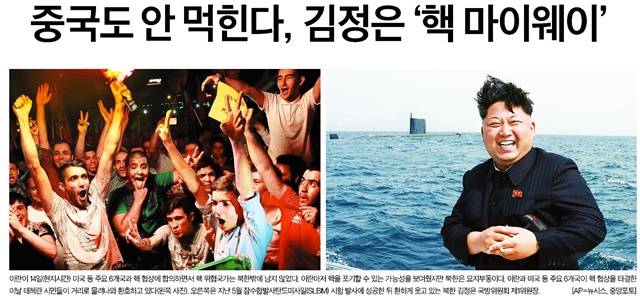 중앙일보는 “이란이 14일(현지시간) 미국 등 주요 6개국과 핵 협상에 합의하면서 핵 위협국가는 북한밖에 남지 않았다”며 테헤란 시민들이 핵 협상에 환호하는 모습과, 지난 5월 잠수함발사탄도미사일 시험에 성공한 뒤 환하게 웃는 김정은 국방위원회 제1위원장의 모습이 나란히 실렸다.