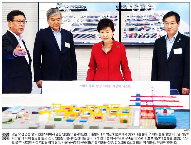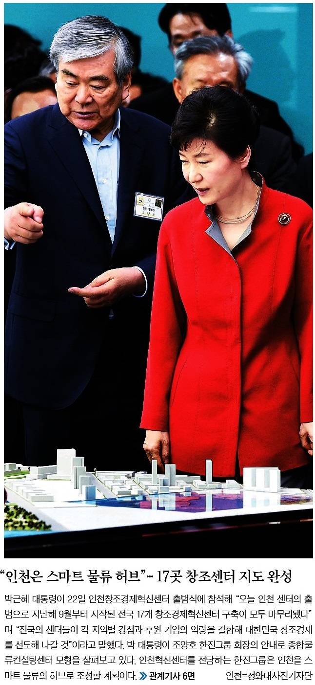 인천창조경제혁신센터가 22일 출범했다. 인천창조경제혁신센터는 전국 17개 센터 중 마지막으로 구축된 곳으로 IT와 물류를 결합한 ‘스마트 물류’ 산업의 거점 역할을 하게 된다. 23일 대부분의 신문들은 인천 송도 컨벤시아에서 열린 출범식에 참석한 박근혜 대통령의 모습을 1면 사진에 담았다.