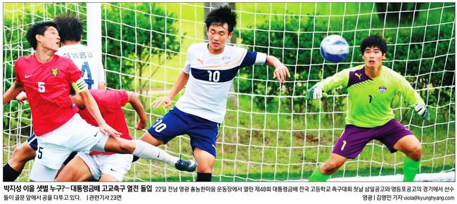 경향신문은 22일 전남 영광 흥농한마음 운동장에서 열린 제48회 대통령금배 전국 고등학교 축구대회 첫날 삼일공고와 영등포공고의 경기 모습을 1면 사진에 담았다.